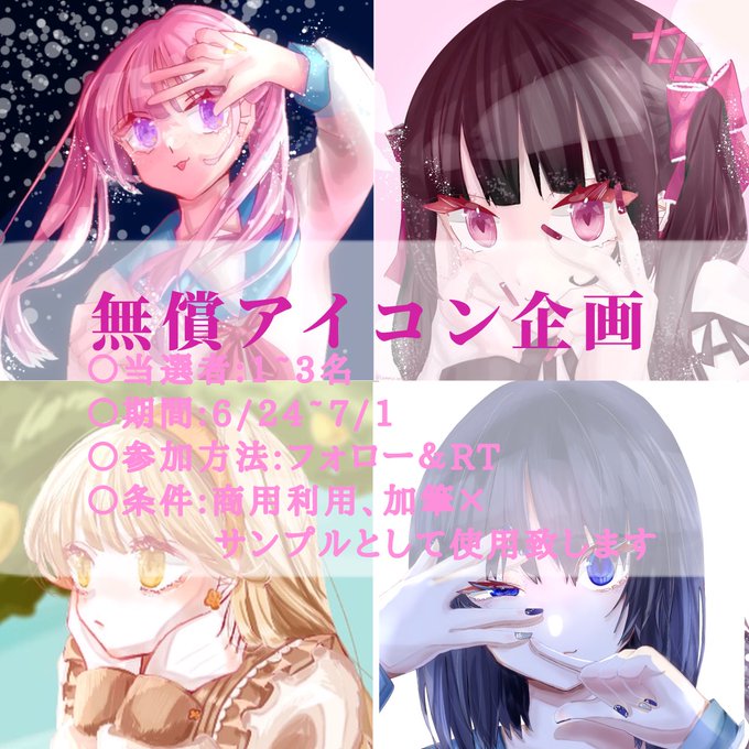 〇アイコン企画〇 無償でイラストお描きします.* 〇参加:フォロー&RT 〇1~3名 〇絵:無償企画なので版権🙆♀️ 人物1人背景無しになります。 ポーズ等指定していただけると助かります🫶 #無償企画 #無償イラスト #アイコン企画 #アイコン無償企画 #絵描きさんと繫がりたい