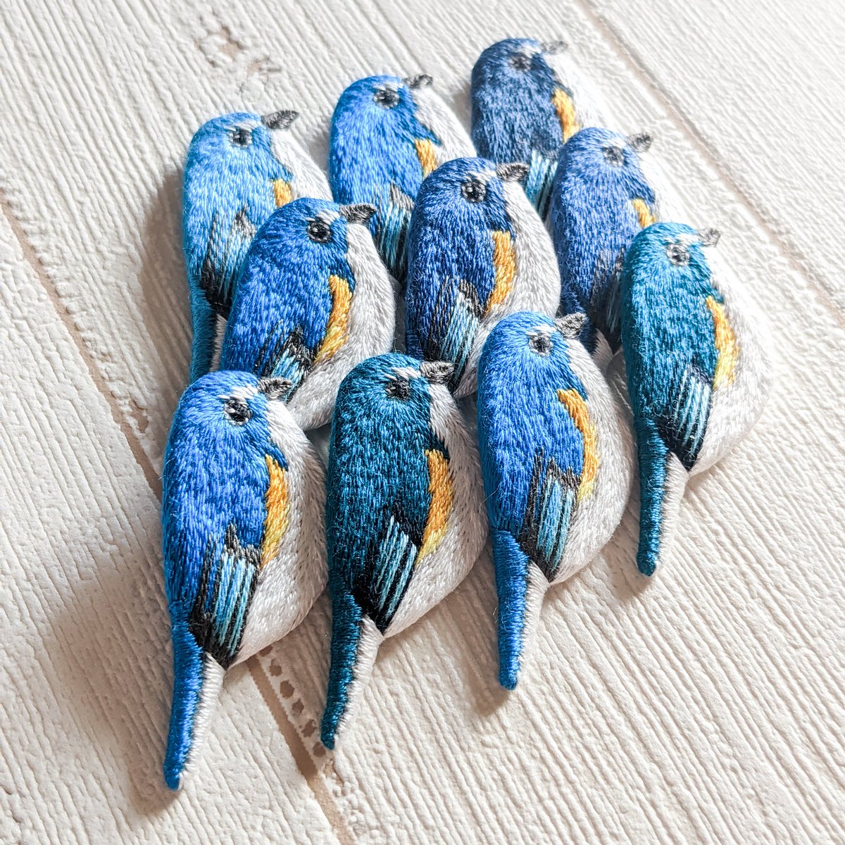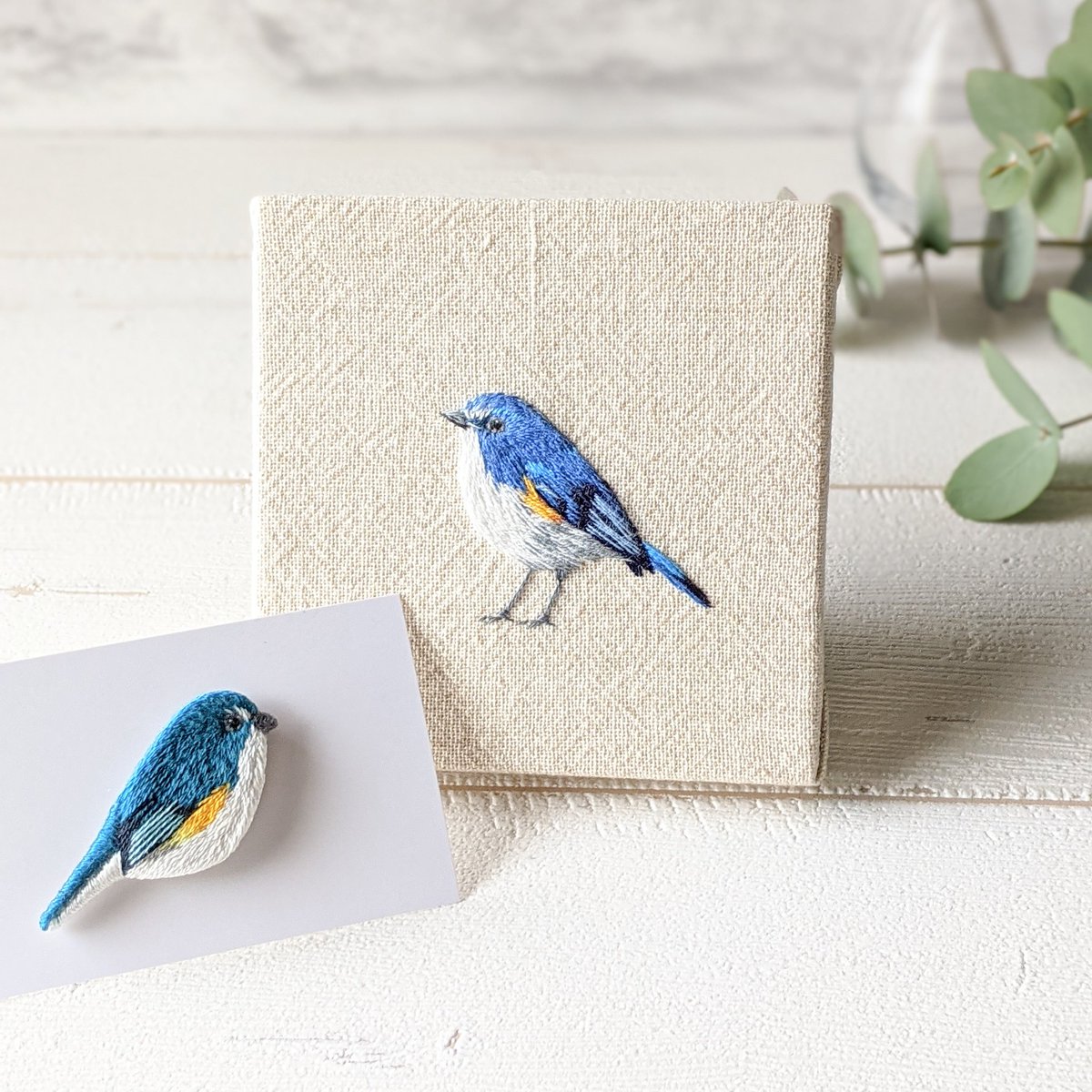 31 300 ルリビタキさんの刺繍が完成しました。 明るめのブルーとレモンイエローの色合いがとても可愛いです♡ ブローチにお仕立てして販売します🥰 #ルリビタキ #鳥ブローチ 22/01/31 20:45