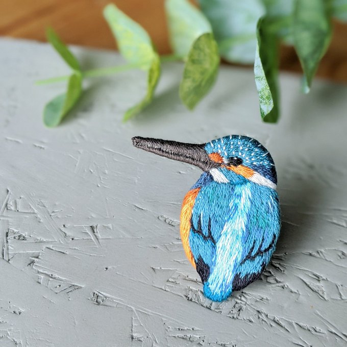 カワセミさんが出来上がりました😊 秋なので、背中の羽は濃いめのブルーグリーンで刺繍しました🕊 #カワセミ #鳥ブローチ