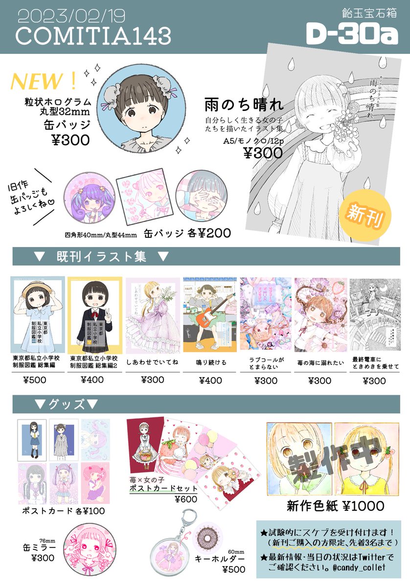 🌼お品書き🌼 2022/05/15 #制コミのオフ会 【B02】飴玉宝石箱 新作は創作制服ポストカードです。 #COMITIA140 の新刊も持っていきます。 既刊では「東京都私立小学校制服図鑑 総集編」がおすすめです! よろしくお願いいたします!