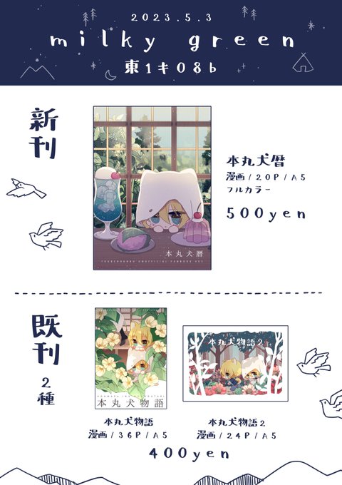 5/3 超閃華 お品書き milky green 【東1キ08b】 既刊のいぬんば本も持っていきます! よろしくお願いいたします。 【pixiv】pixiv.net/artworks/10766… 【新刊】pixiv.net/artworks/10748…