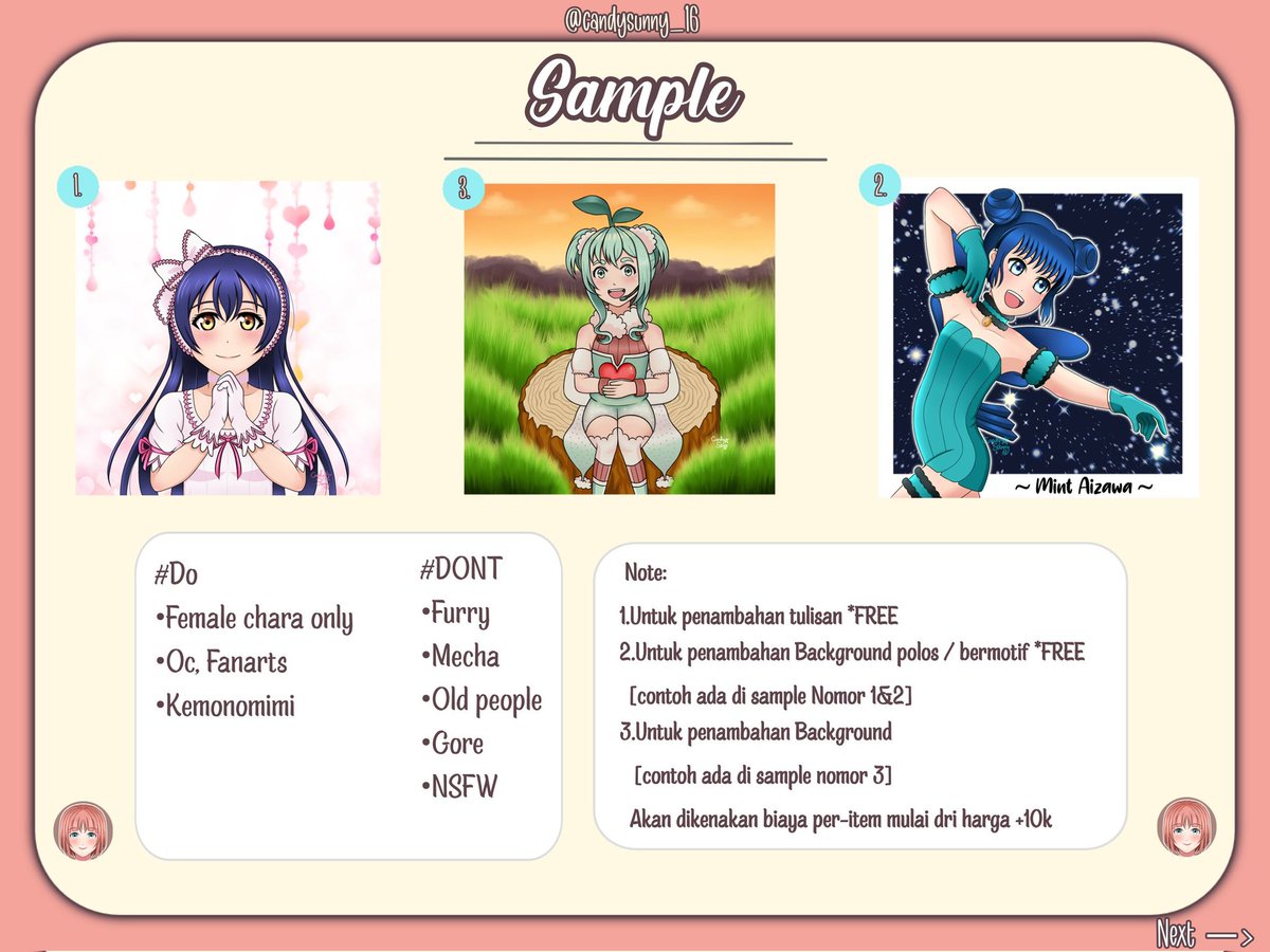 [IDN🇲🇨 & Female chara only] [Like,Rt,And share are really appreciated] Halo semuanya, Aku mau Open Commision dengan style anime seperti gambar dibawah. Apabila kamu tertarik tapi masih ragu” Boleh tanya aku dulu kok! #commissionsopen #artidn #commissionsopen #zonakaryaid