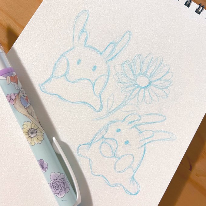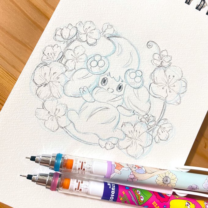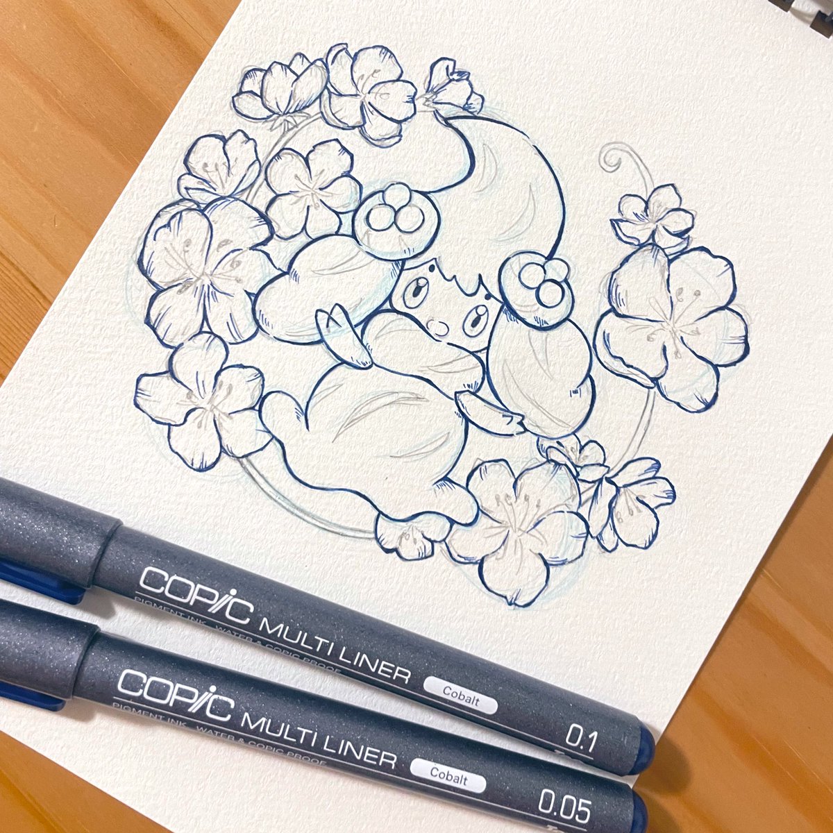 53日目、Baby Blue Eyesのマホイップちゃん🫐下描き🥺 このシリーズ描きたいのあとメッソンかな…🦋💙みんなかわいい☺️ コピックマルチライナーのコバルトが気になっててそれでペン入れしたい🖋ターコイズブルーも見つけたら欲しい😭 #100日チャレンジ #ポケモンイラスト #マホイップ