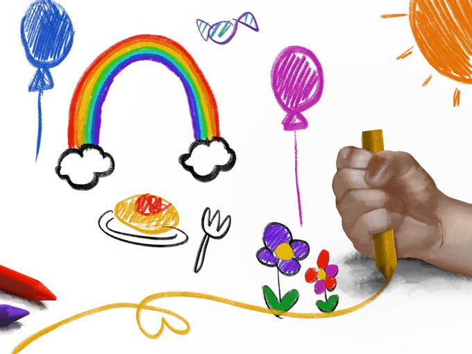 中2娘がiPadに描いたオリジナルイラストです🎨 テーマは「ワクワク」🎶 小さな子どもの頃に好きだったモノを、小さな子どもがワクワクしながら画用紙に描いている感じで表現しました🎨 #デジタルイラスト #イラスト #デジタルアート #お絵描き #絵 #art #artwork #drawing #digitalart #illustration