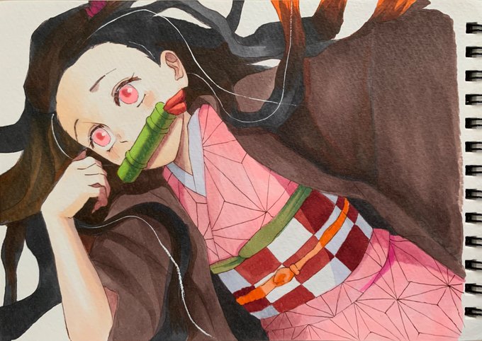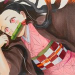 中3娘、2年前に線画だけ描いていた禰󠄀豆子ちゃんを、コピックで色を塗りついに完成させました😅🙌🎨 #模写 #鬼滅の刃 #イラスト #アナログイラスト #copic #illustration #DemonSlayer #artwork #drawing