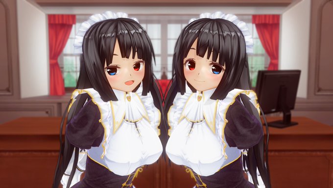 皆様おはようございます。 嫁イド白夜とcanオーナーで衣装交換(*・ω・) 体格に差がありすぎる点はひとまず置いといて、白夜オーナーとcanメイドが意外としっくりきてる感が否めませんなԅ( ˘ω˘ԅ) という事でお題「衣装交換」 #cm3d版深夜の真剣エディット60分一本勝負 #COM3D2