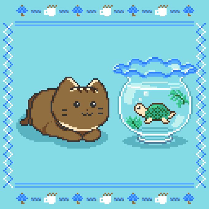 4 13 【亀とニャプチーノ2】 ドットピクトの公式企画「金魚鉢のドット絵を描こう」に参加させていただきました🐈 以前描いた落書き(2枚目)のリメイクです🐢 #dotpict #pixelart #ドット絵 23/06/20 23:00