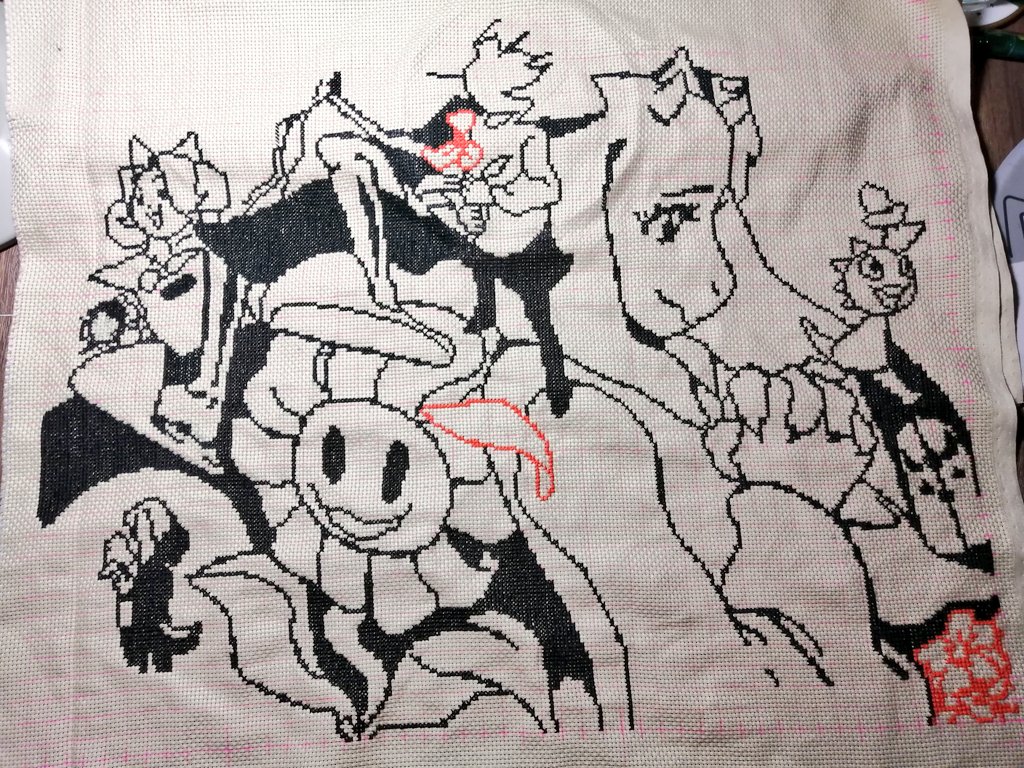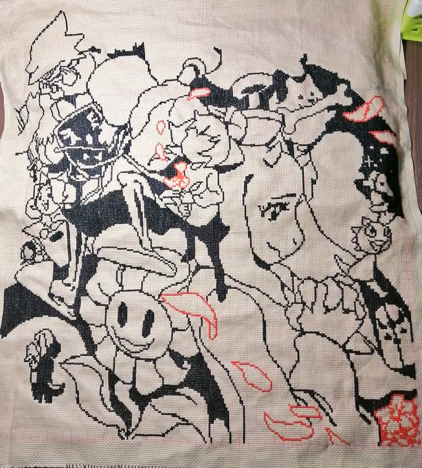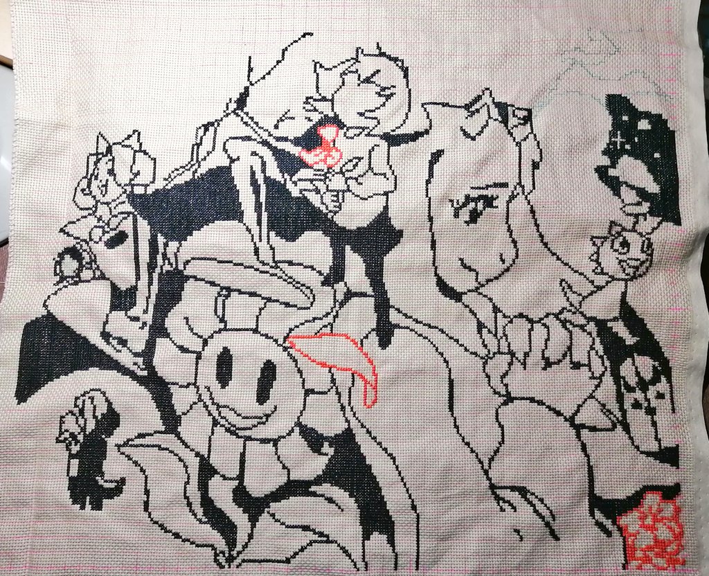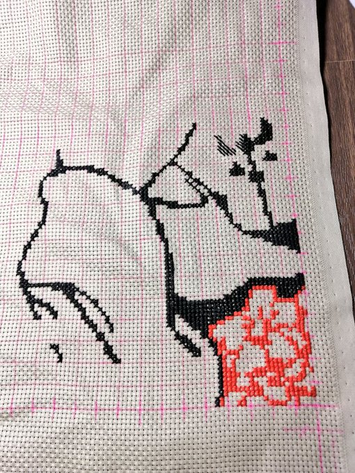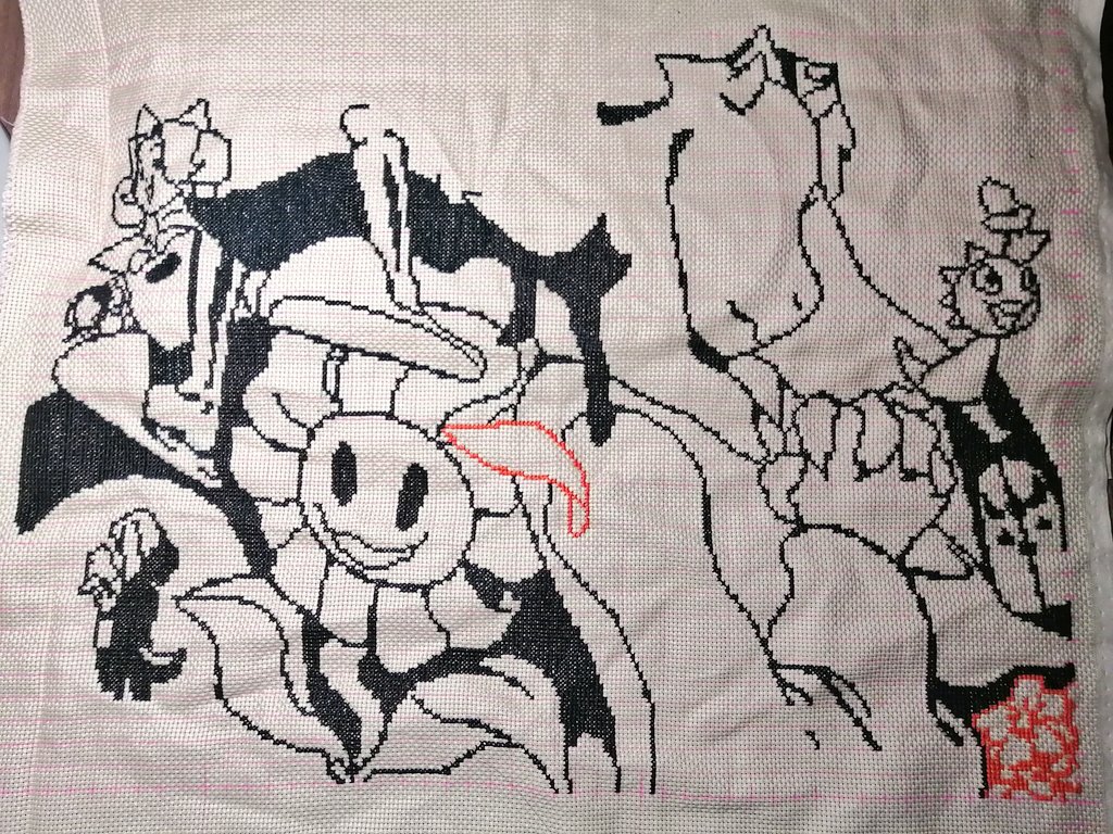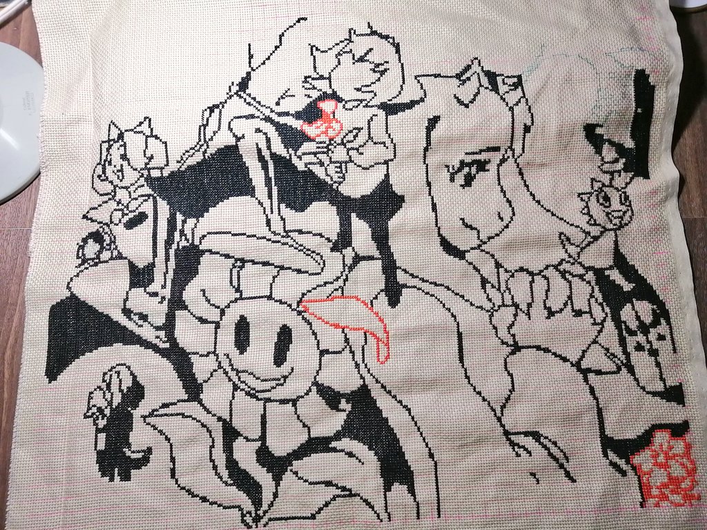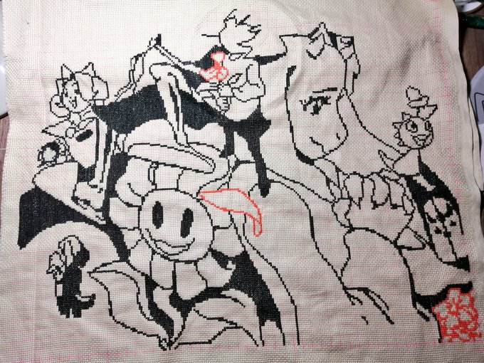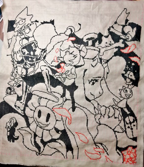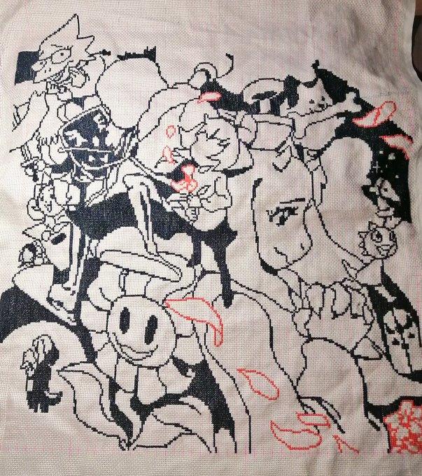 刺繍29日目 花びら足していきました。 しっかりとした図案はないので修正しながら毎回刺しています。 黒は半分くらい終わったかな #刺繍 #ドット絵 #クロスステッチ #undertale #pixelart #crossstitch