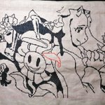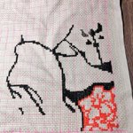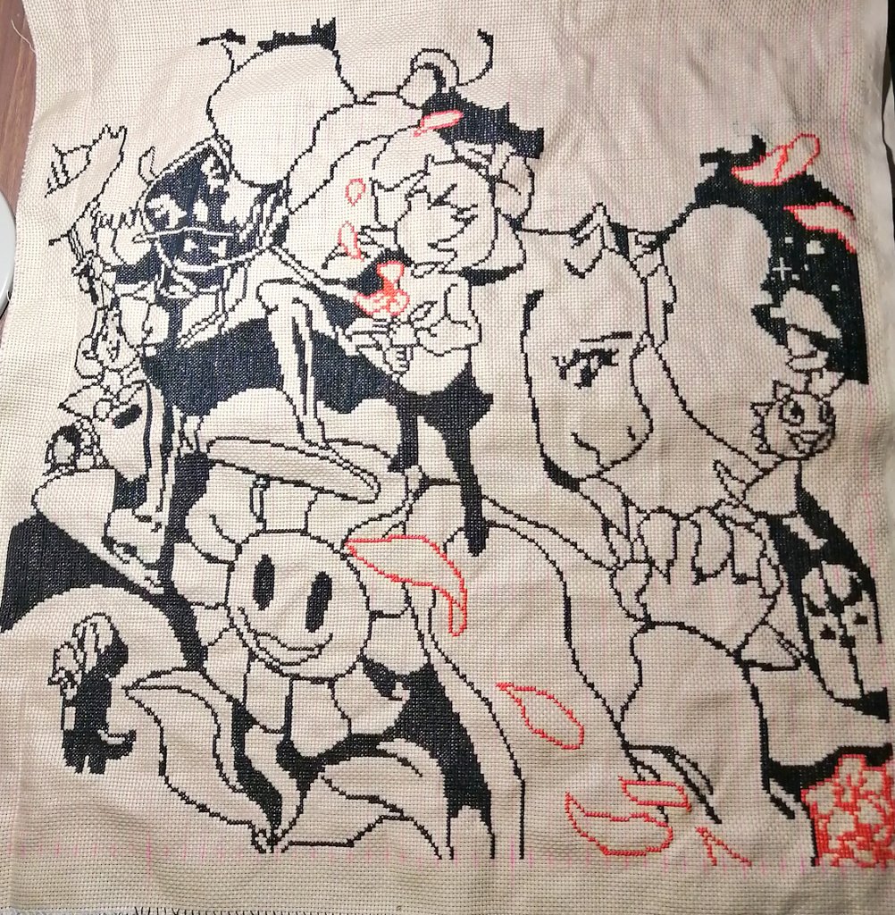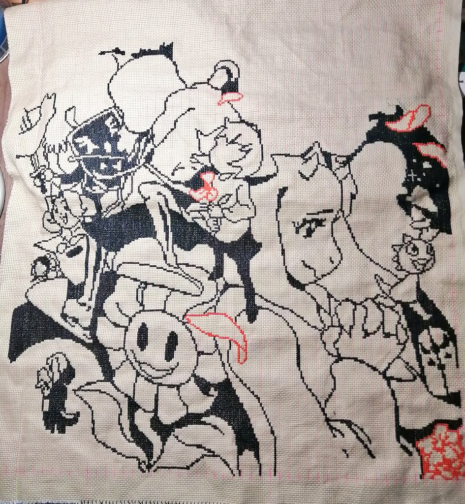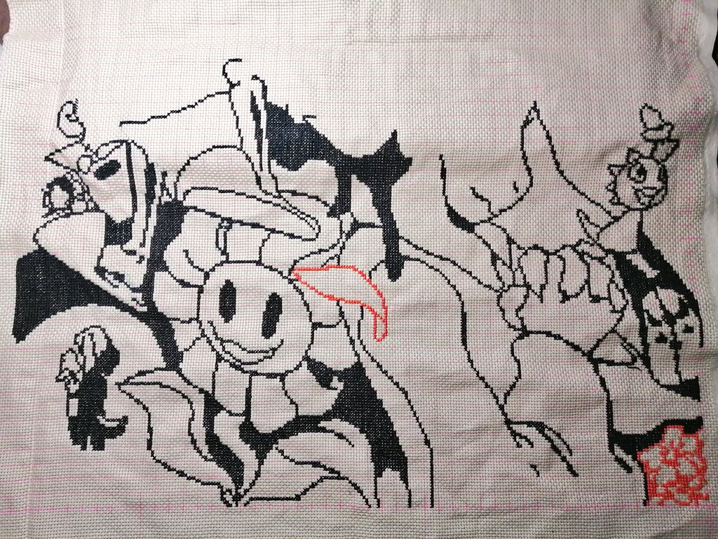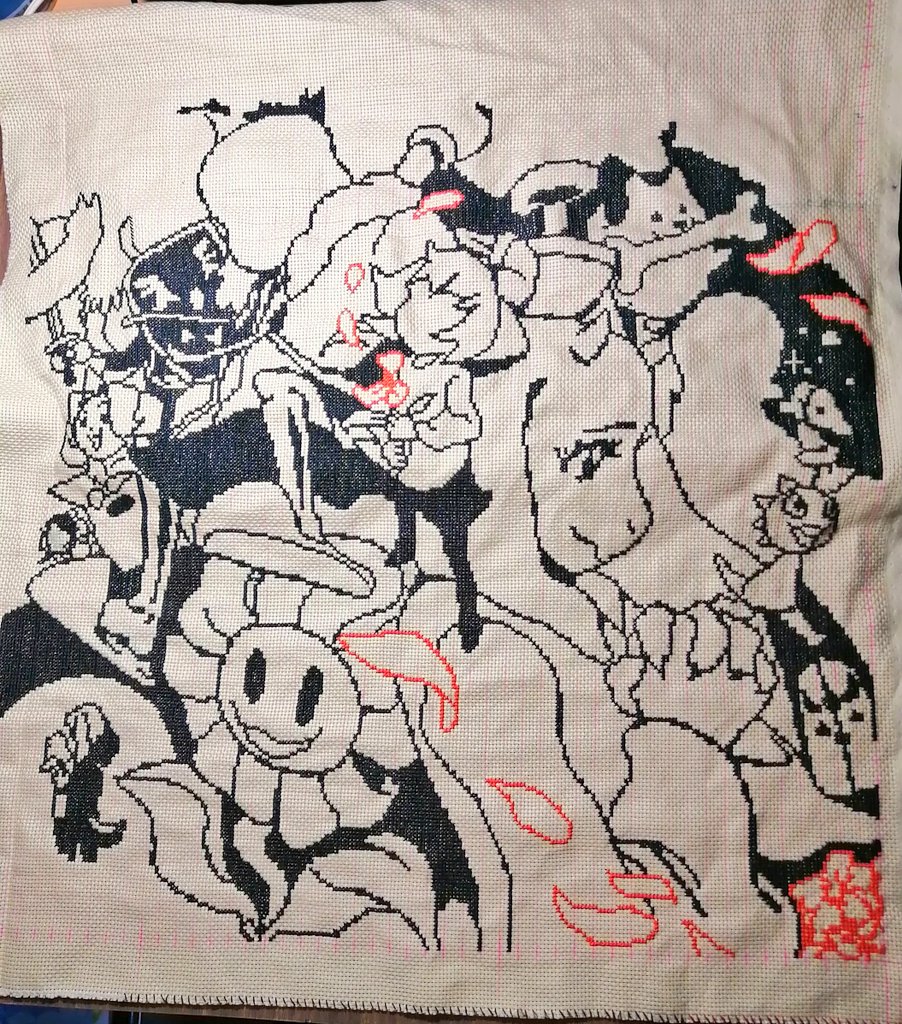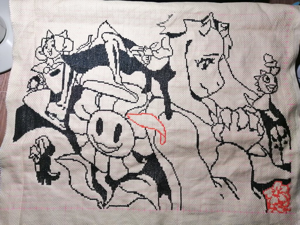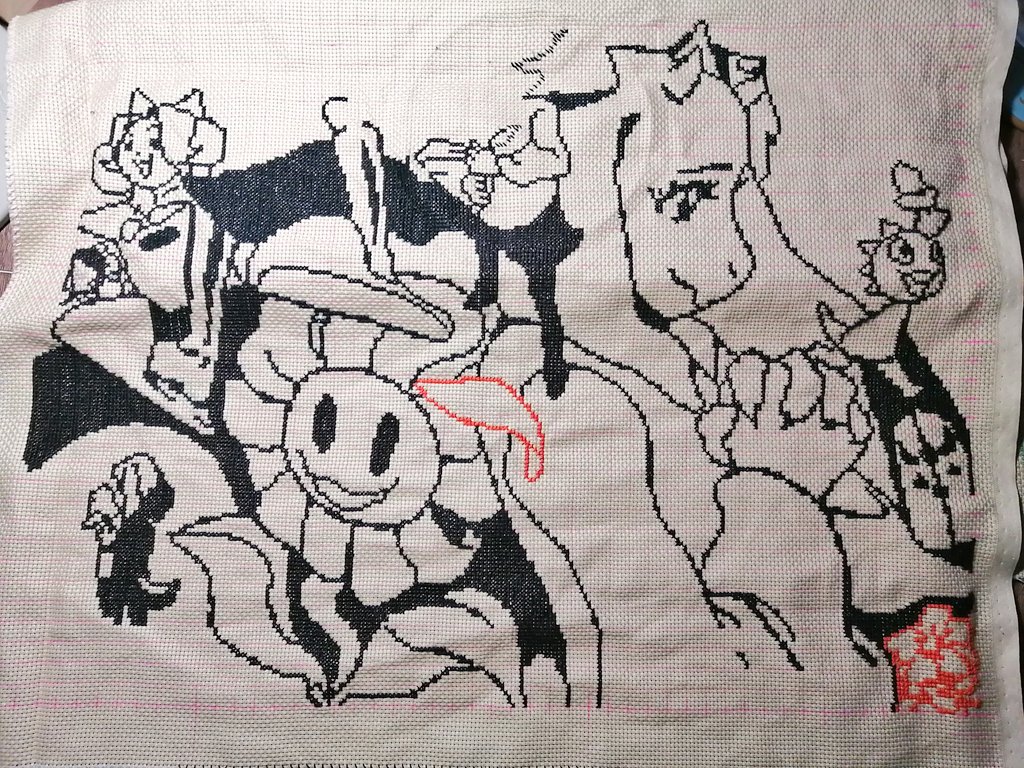 刺繍29日目 花びら足していきました。 しっかりとした図案はないので修正しながら毎回刺しています。 黒は半分くらい終わったかな #刺繍 #ドット絵 #クロスステッチ #undertale #pixelart #crossstitch