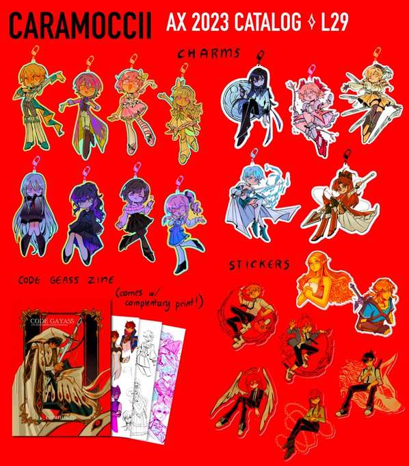 my catalog for AX!! i’ll be tabling with @qrbits_ at L29!!! it’s my first time at Anime Expo ever so pls pls come and say hi!!! i have charms, prints, stickers (hopefully!), and my code geass zine 🥳 #AX2023ArtistAlley #AXArtistAlley2023 #AX2023