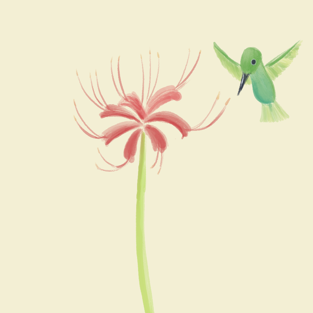 彼岸花とハチドリ ちなみにヒガンバナ属をLycoris(リコリス)といい、別種の甘味料等に使われる、甘草という薬草もLicorice(リコリス)というそうです。 なので今人気のアニメもお菓子の話なのかと思ってました。 #イラスト #彼岸花ウィーク2022
