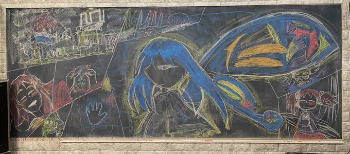 〈21日目〉 メアリと魔女の花を家の黒板に描きました。下手なのでいいねしなくてもいいけどしてもいいけどもうどうでもいいです。カエルママがこの絵テュイッターにやれと言ったので。 #100日チャレンジ #イラスト #黒板アート #絵師さんとつながりたい
