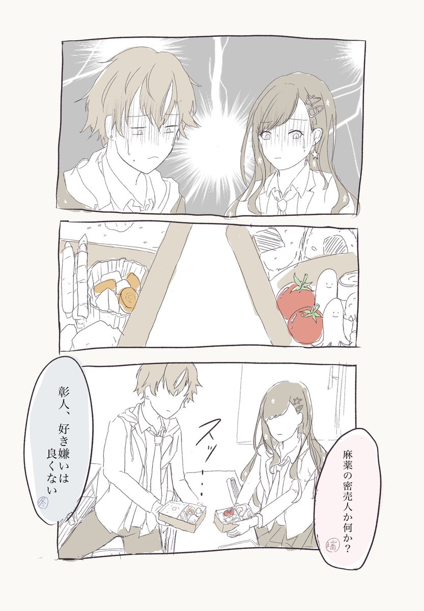 #彰杏版ワンドロワンライ お題「交換」お借りしました お弁当のおかずを交換する彰杏です。神高のお昼ごはん