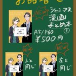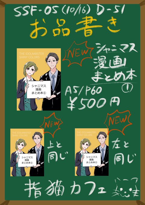 56 193 #SSF05 でもしかしたら出るかもしれない本の表紙など 「シャニマスまとめ本①」60p 500円 このどう見てもPはづ本にしか見えないのが表紙、 最後の2枚はネットに上げてない2Pの一部です Pが照れたり、天井努が打ちひしがれたりする予定です 安いよ安いよ 22/10/10 20:34