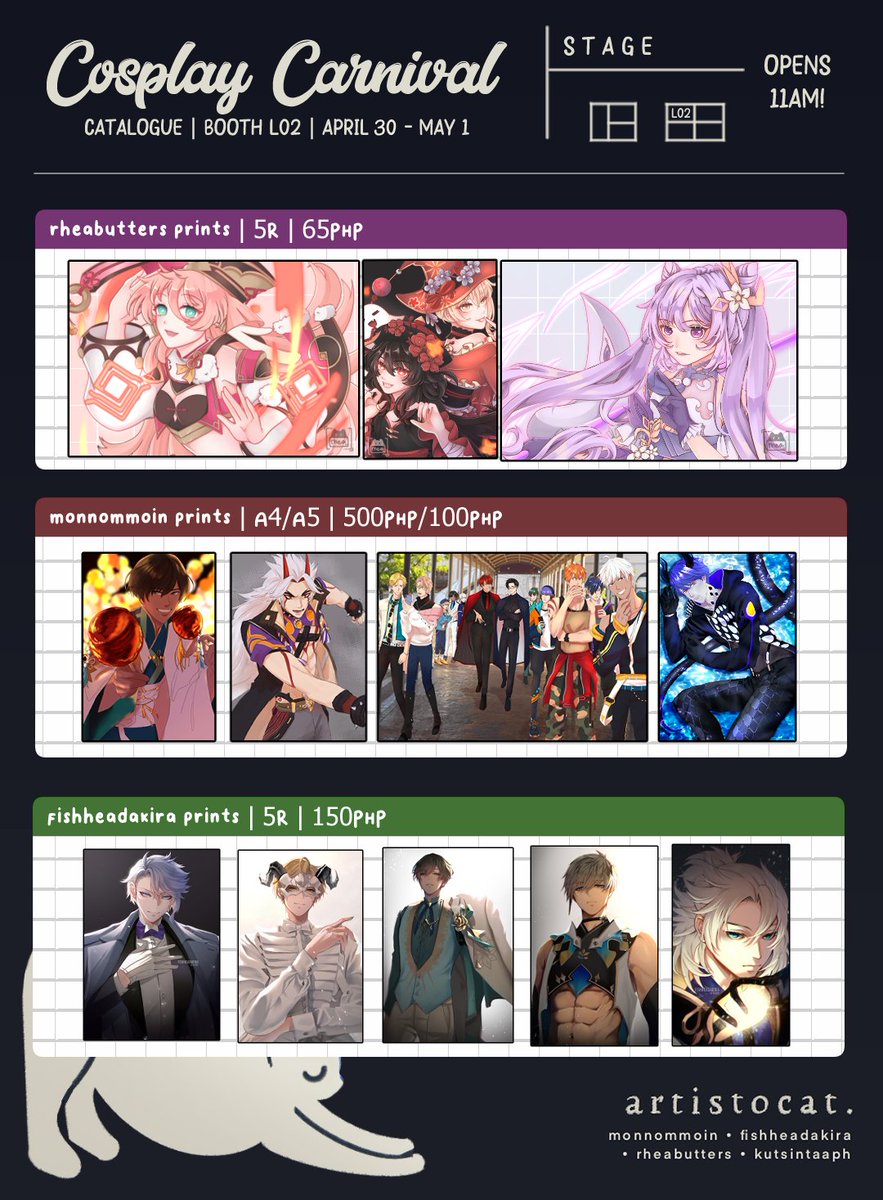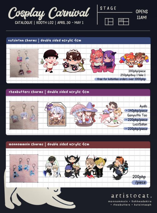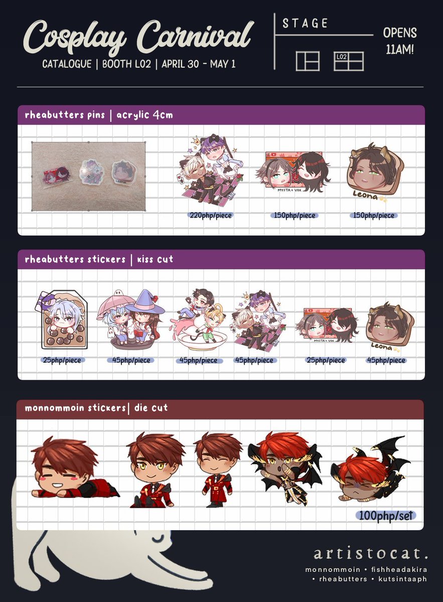 Hello 🍓💥 !! I'll be boothing at #CosplayCarnival2022 this weekend with GamersHigh! You can find us near the stage (our booth is L02 ^__^) Below is our catalogue!! Gates open at 11am. I'll be selling with @monnommoin @rheabutters and @FishHeadAkira 💗