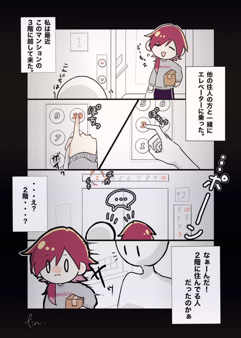 ステージ19(?)『エレベーター』 Q.赤髪の青年が2階でエレベーターを降りた理由は? (リプ欄に解説あり) #イロ絵す