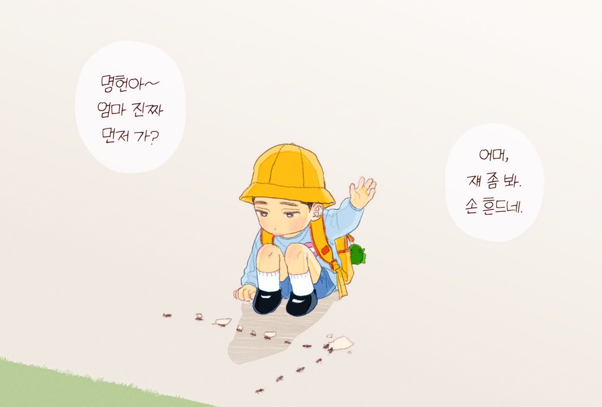 저의 어릴적 일화를 아기명헌으로 그려보았읍니다 개미구경하느라 그냥 자기를 두고 엄마 먼저 집에 가라고 했던 어린이였답니다
