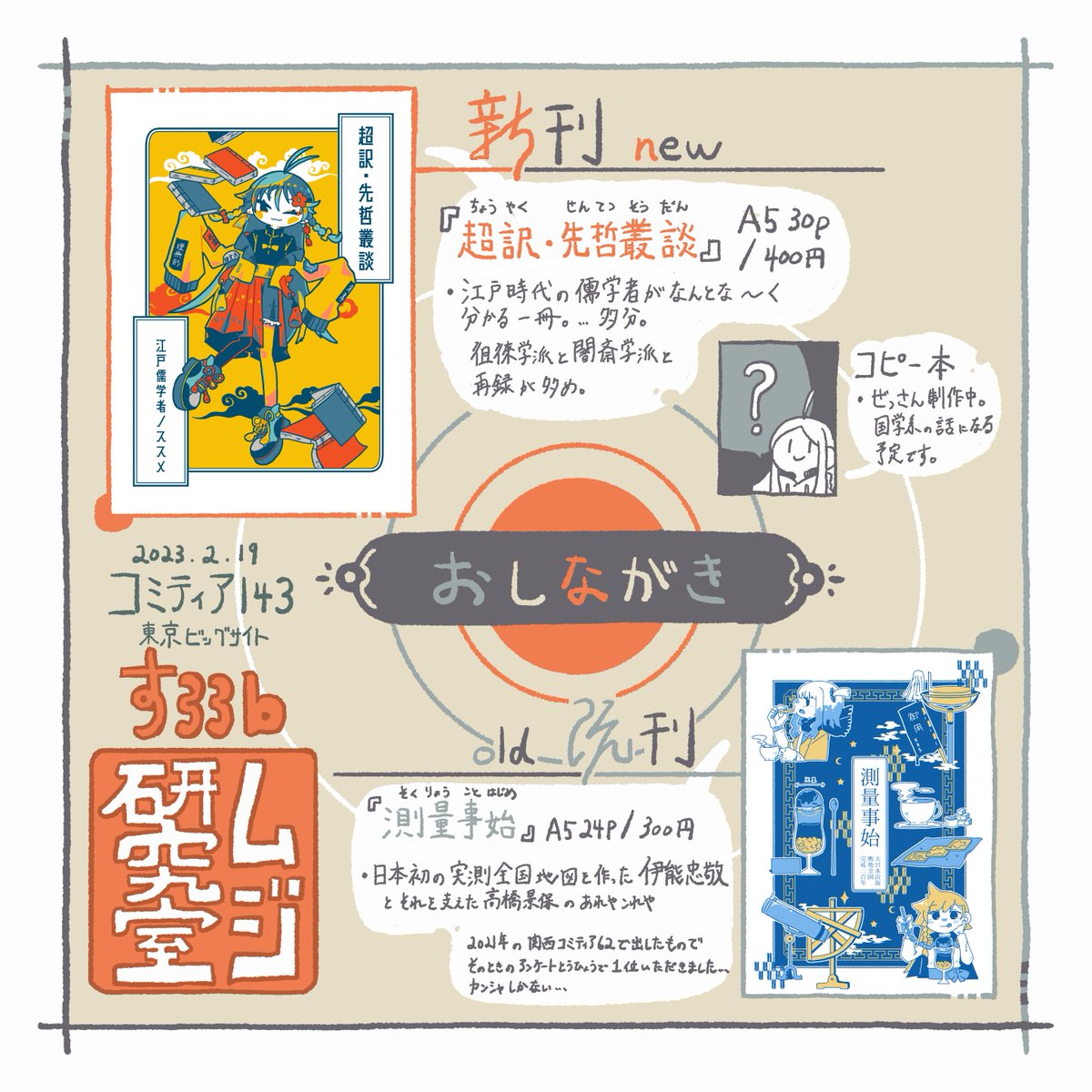 #コミティア143 #COMITIA143 今週末2/19コミティア143のお品書きです 江戸時代の学者さんたちを擦って遊んでいます。ハヤシラザンからモトーリノリナガ、イノ-タダタカまで。 ※関西コミティア62で頒布したとき、ありがたいことに全部はけてしまった『測量事始』を再版したので持っていきます。