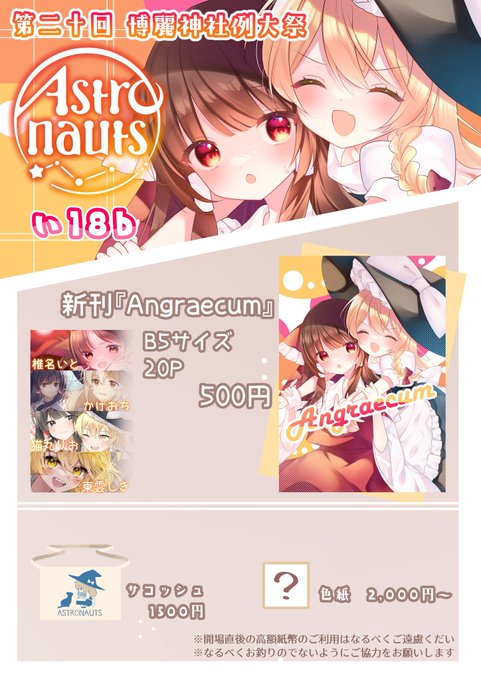 64 150 5/7 第二十回博麗神社例大祭のおしながきです🍫✨ 当日は【い18b Astronauts】でお待ちしております 今回の新刊はかげおちさんとの合同本で、レイマリちゃんオンリーのイラスト本になっております💪 そしてとっても素敵なゲストさんも…🥰✨ 良かったら手に取っていただけると嬉しいです🙌 23/04/29 11:17