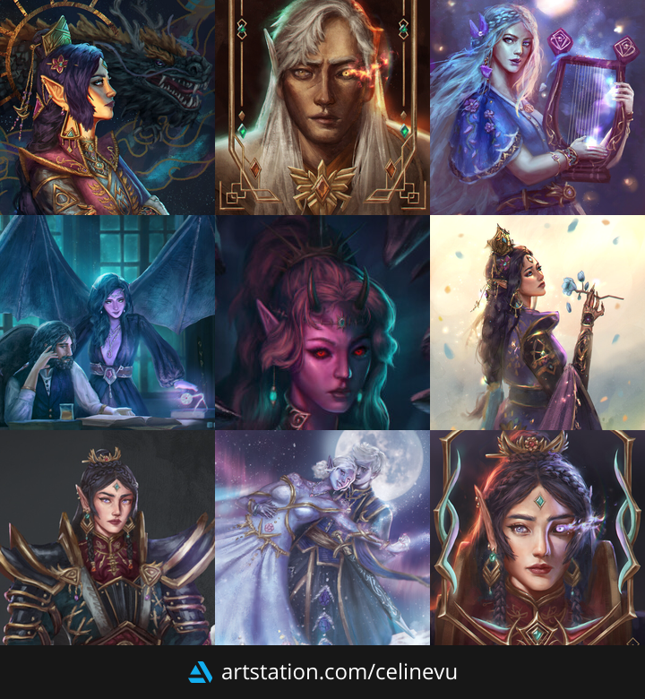 Happy #Portfolioday everyone! (: I'm Céline, a freelance fantasy illustrator with a big heart for painting magical things. I have worked on publishing and ttrpg projects ✨ I'm open for all kinds of freelance opportunities! 💫 celinev.art@gmail.com 💫 celinevu.nl/commissions/