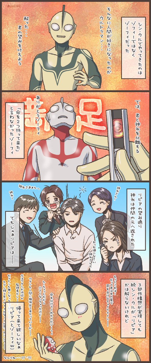 あの状況だとやっぱり…ぴえぇ。゚(゚´Д`゚)゚。でも続でリピアさん帰ってくるんじゃないかって希望が捨てきれない!! だってゾーフィさん優しかったじゃん!! あのまま文字数 #シンウルトラ感想戦 なんかオシャレな塗り方したくてこねくり回してみたけど結局いつもと変わらず…φ(¯∇¯๑;)ハハハ