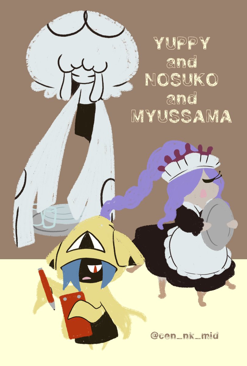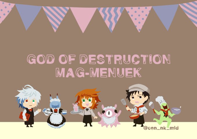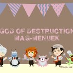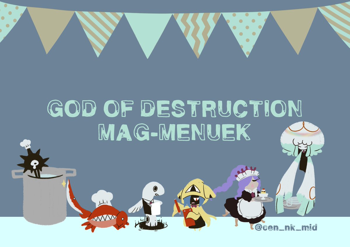 マグちゃんコラボカフェイラストその2!邪神は前に上げたけどそこから結構変えてます。背景と文字は最初の色相から逆にしたんだけどいい感じになってくれました。当日にユッピーの色が出たから急いで変更したよ~描くの本当楽しかった!!! #破壊神マグちゃん混沌芸術祭
