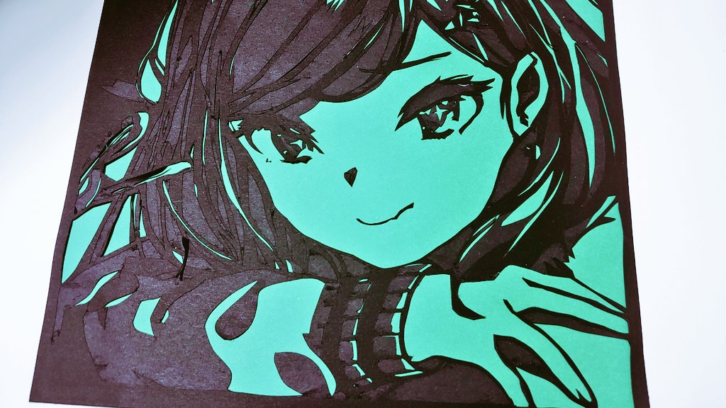 #こよりのおたより #V切り絵 #切り絵 如月こよりちゃんの切り絵完成。元気いっぱいで配信楽しい! デザインもすごく好き、綺麗な色 で印象深い!