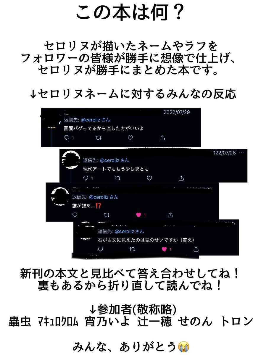 新刊のおまけに謎の本つけます! なんと16ページもあります!? 6人も参加してる!豪華! あまり数はありません欲しい人は購入時に言ってね☆ 引用RTに元の投稿まとめてあります! twitter.com/ceroliz/status…