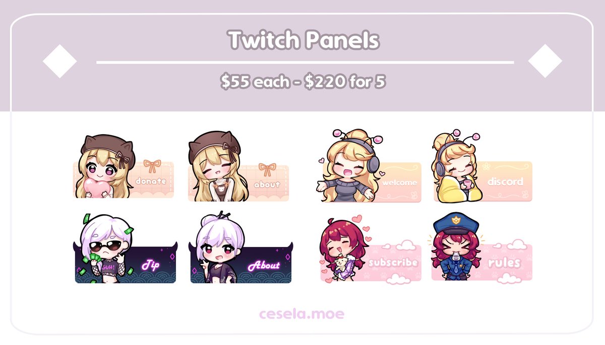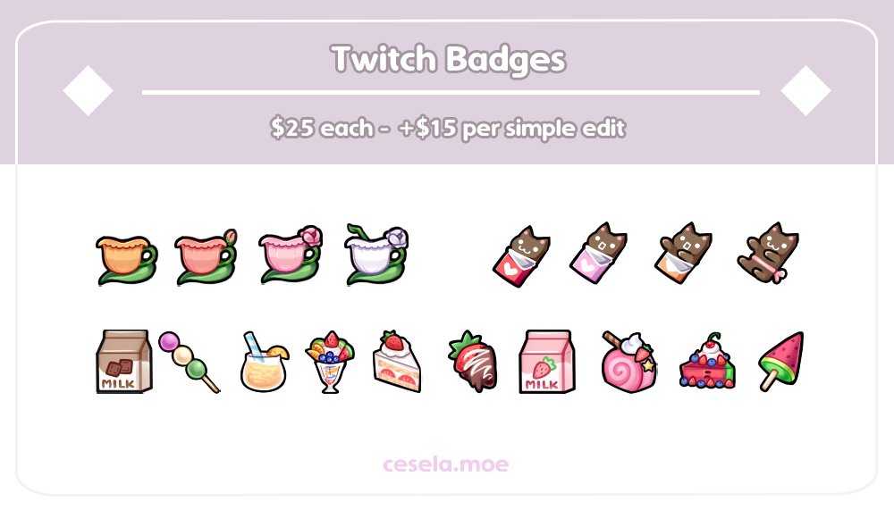 🍬Commissions Open🍬 Updated work post! Here are of my available Twitch commissions at the moment. Emotes, Panels, and Sub Badges! Looking forward in working with you ☺️ ❤️ Form and details on my website here: cesela.moe/#commissions