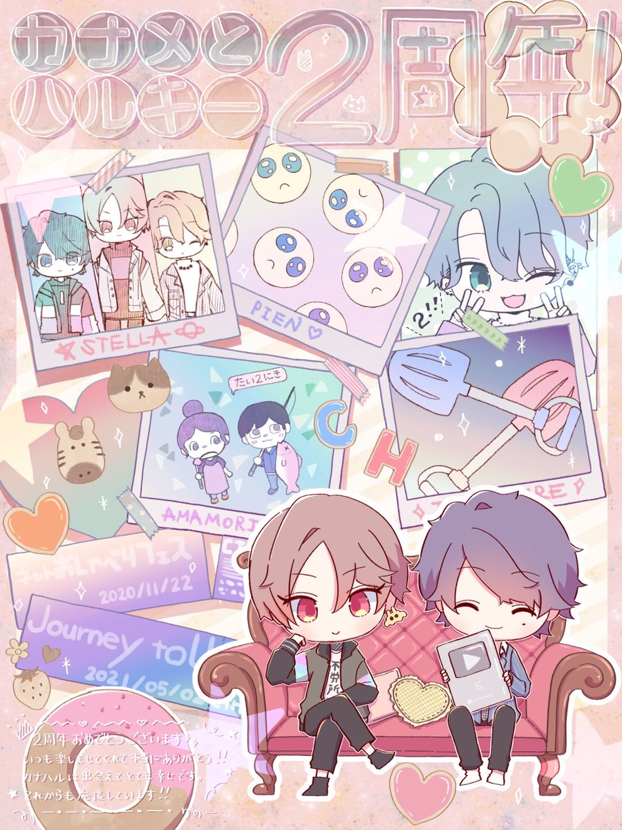カナメくんお誕生日おめでとうございます🎉 今年もお祝いできて嬉しいです🌟素敵な一年になりますように!これからも応援しています🥳✨ 去年のお誕生日から今年までの活動の思い出を詰め込んだ絵を描きました☺️💝 #カナメ誕生祭2021 #カナハルART #カナメパトロール