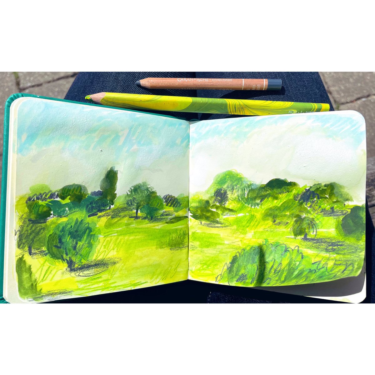 Drawing the view across the River Colne from Wivenhoe Quay. Excited to use my green magic pencil. #landscape #wivenhoe #essex #illustration #pleinair #picturebook #kidlit #illustrator #drawing #magic