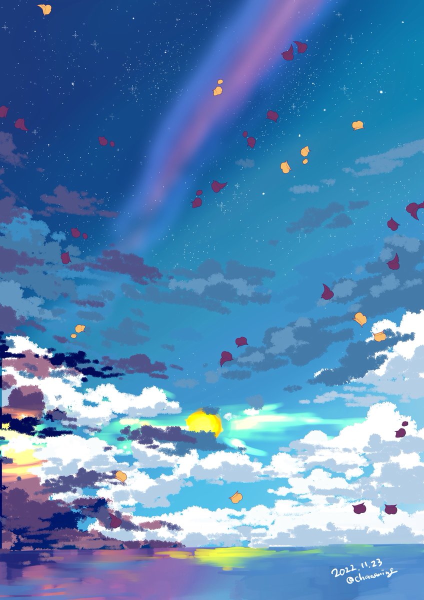 6 29 『すずめの戸締り』、空がとても綺麗だったので真似して描いてみたの図です。人物描く余裕は無かった…… 22/11/23 21:54