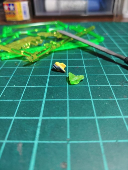 カメラアイが普通の樹脂なのでクリアパーツ2色接合して削り出しました。 レジン使えばいいんじゃないかって? うるせぇ!やりたいからやってんだよ! #ガンプラ
