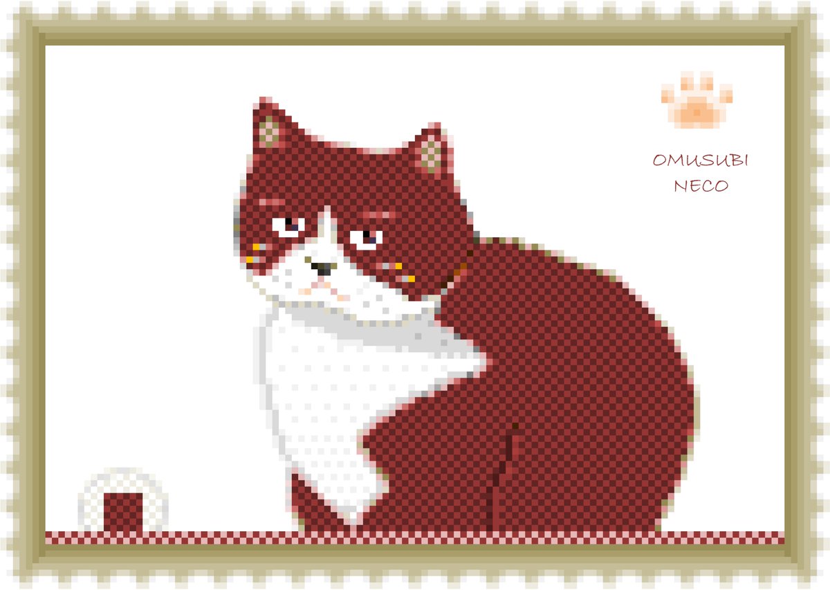 うちの猫🐈をモチーフに、記念切手風の #ドット絵 を描いてみました^^ おむすび🍙のような顔が特徴的な子です(笑) #Opensea のギャラリーに展示してみましたので、よければ御覧ください^^ opensea.io/OMUSUBI-NECO #猫 #cat #ハチワレ #おむすび #pixelart #NFT
