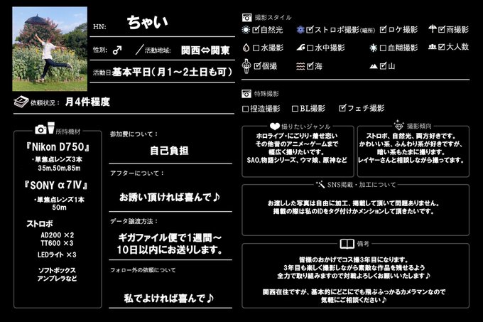 関西⇔東京を中心にどこでも吹っ飛ぶふっ軽カメラマンです✨ ホロが多いですが以外も撮ります♪ なんだかんだで3年目🎉 3年目も沢山撮影行きたいので皆様よろしくお願いします😉 ※モデル様はコメ欄へ #カメラマンさんと繋がりたい #コスプレイヤーさんと繋がりたい #相互の相互さんと繋がりたい