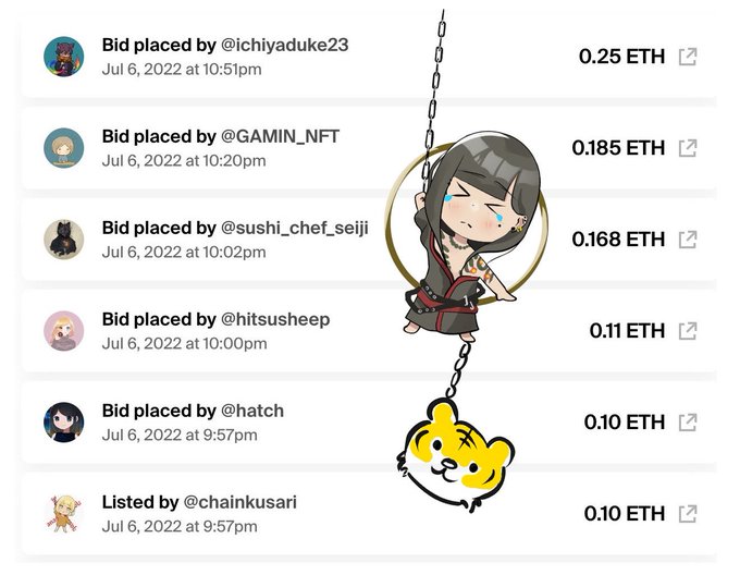 開始すぐにたくさんのbidありがとうございます😢 内心満足ですが、作品の価値を高めるためにいけるとこまでチャレンジしたいです❤️🔥 foundation.app/@chainkusari/b… まだまだbidお待ちしております‼️ (@cryptomoyan ) (@hitsusheep ) (@tosawin ) (@yyoko111 )