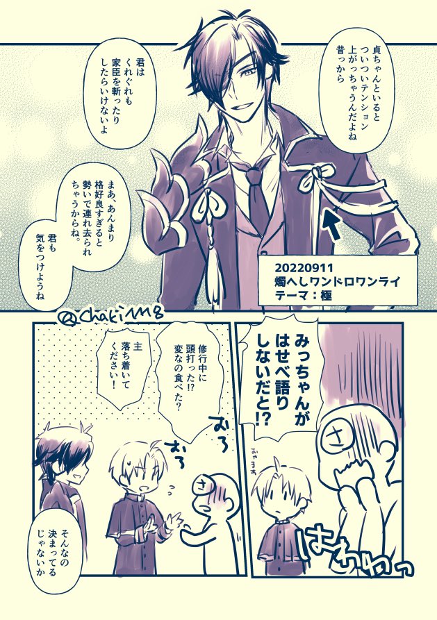 みっちゃんおめでとう✨ うちの本丸の初太刀で顕現時は、なんかホストきた…え?一人称 が僕なの???って驚いたのが懐かしい ピンの過去絵が不穏なのばかりしかなくてお祝いにならなそうで正直ごめん #刀帳no73で7月3日は燭台切光忠の日 #7月3日は刀帳番号73燭台切光忠の日
