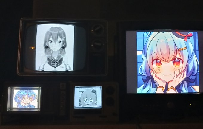 Some Lain core stuff. Small CRT wall of Natsumi Moe. Displays used Sanyo TB-0550 Zenith BT121W2 GE 7-7850B Dell991 I drove them with an Apple IIe, Raspberry Pi 2 and a HP Pavilion 551W with a Geforce FX5200. #natsumi_moe #CRT #vintageTV #retrocomputing
