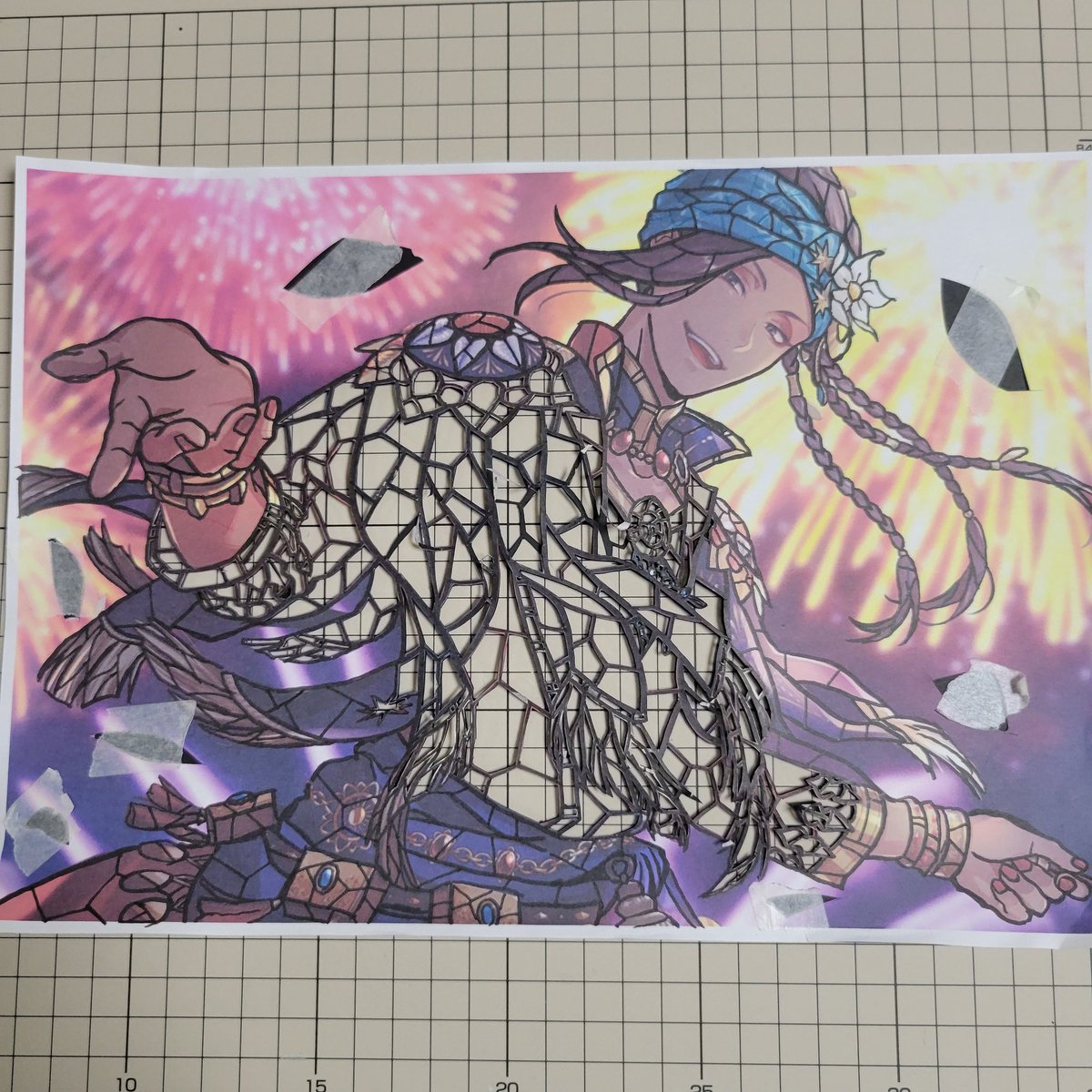 製作時間8️⃣時間 とりあえず切り抜き完了😄 ジャミルの髪綺麗で好きだけど 切り抜く時には何でこんな ややこしい編み込みしてるん だってなる😫💦 色付けと背景の作成は また来週の土日に進めます‼️ #ツイステファンアート #ジャミル #切り絵
