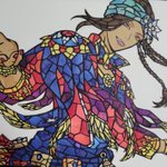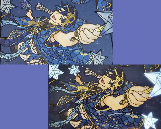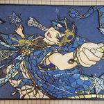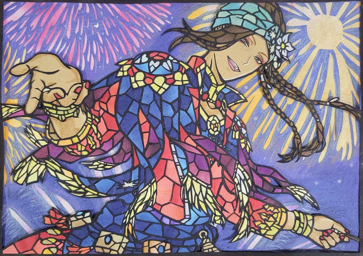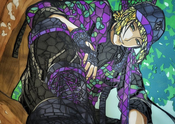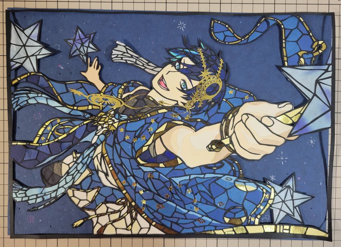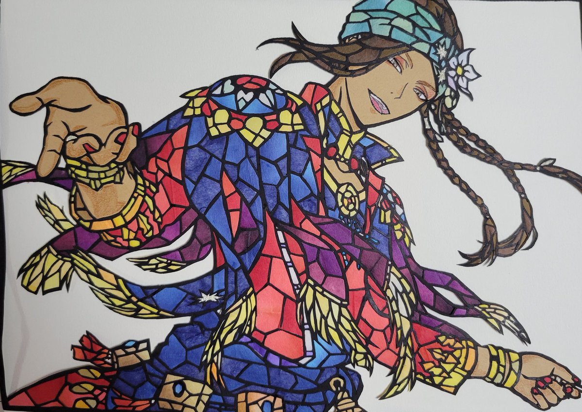 豆イベルーク🏹の ステンドグラス風切り絵完成✨✨ ※肌の影は一部色鉛筆で塗ってます😅 制作時間1️⃣7️⃣時間位 背景とかも何とか表現出来て 良かった😂 #切り絵 #ツイステ #ツイステファンアート #twstファンアート #ルークハント