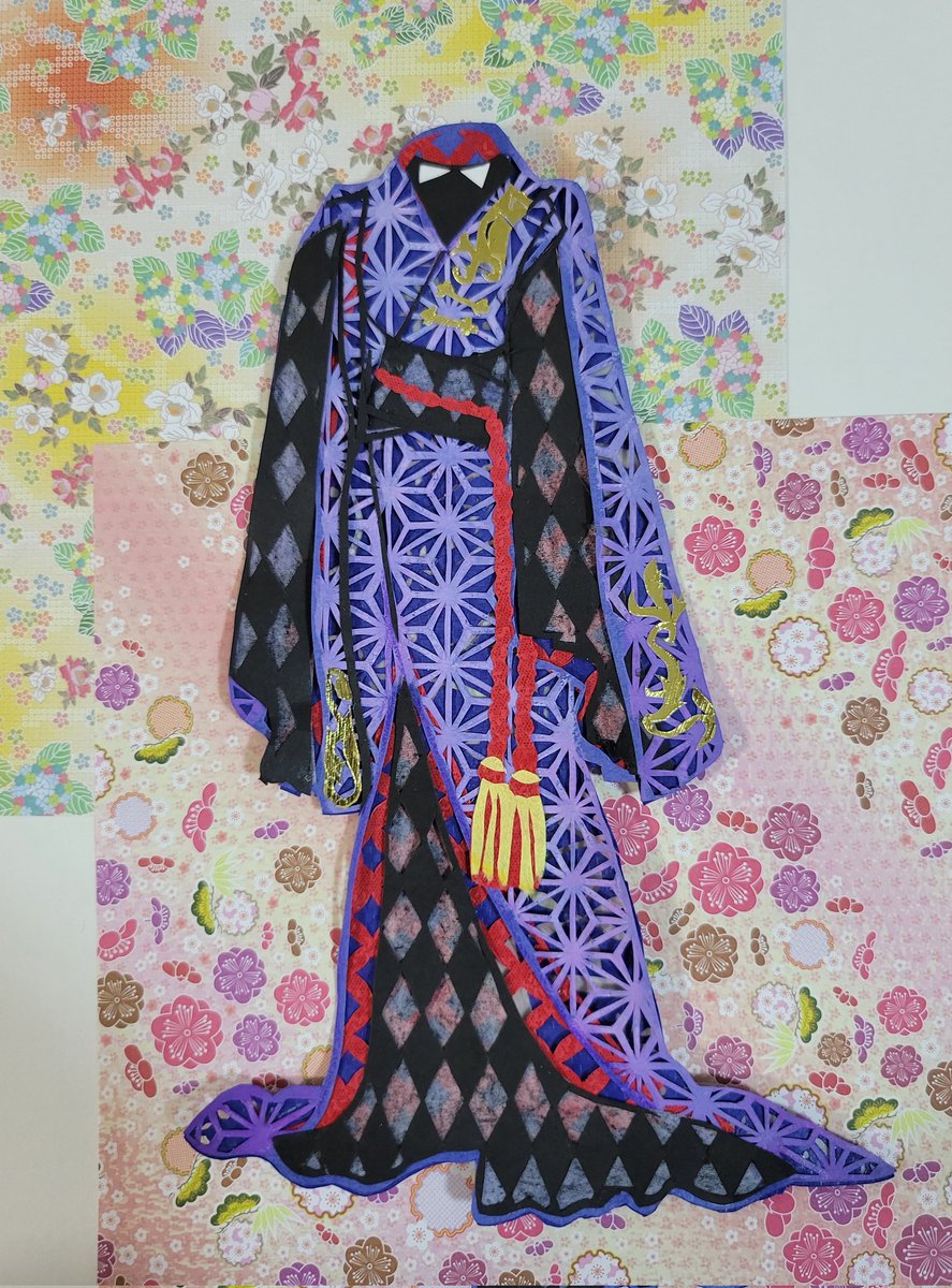ポム寮服の切り絵完成🍎 着物みたいなデザインだから 和柄でデザインしました 完成したけど 思ってたのと違うのは何故😂 時間があったらまた再挑戦します‼️ #ツイステファンアート #ツイステ #切り絵