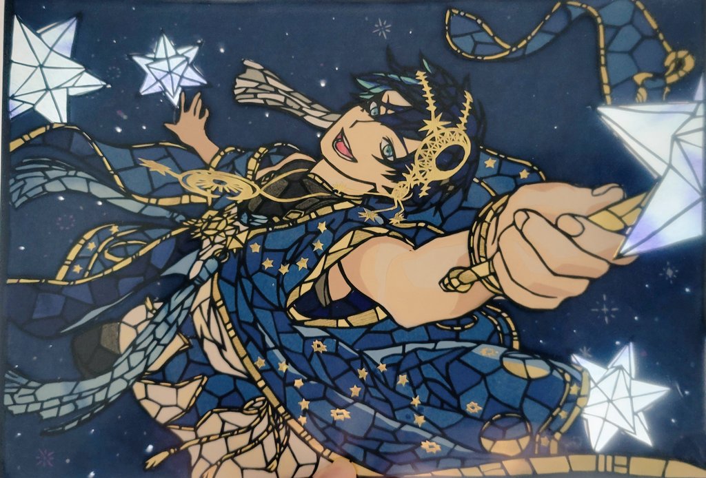 光にかざすと星が キラキラ光ります☺️✨️ 和紙だからこうゆう 楽しみ方もできます💨 ようやくツイステ展で 星送りのハンカチが買えなかった 気持ちが供養できた😂 #ツイステ #ツイステッドワンダーランド #ツイステファンアート #切り絵