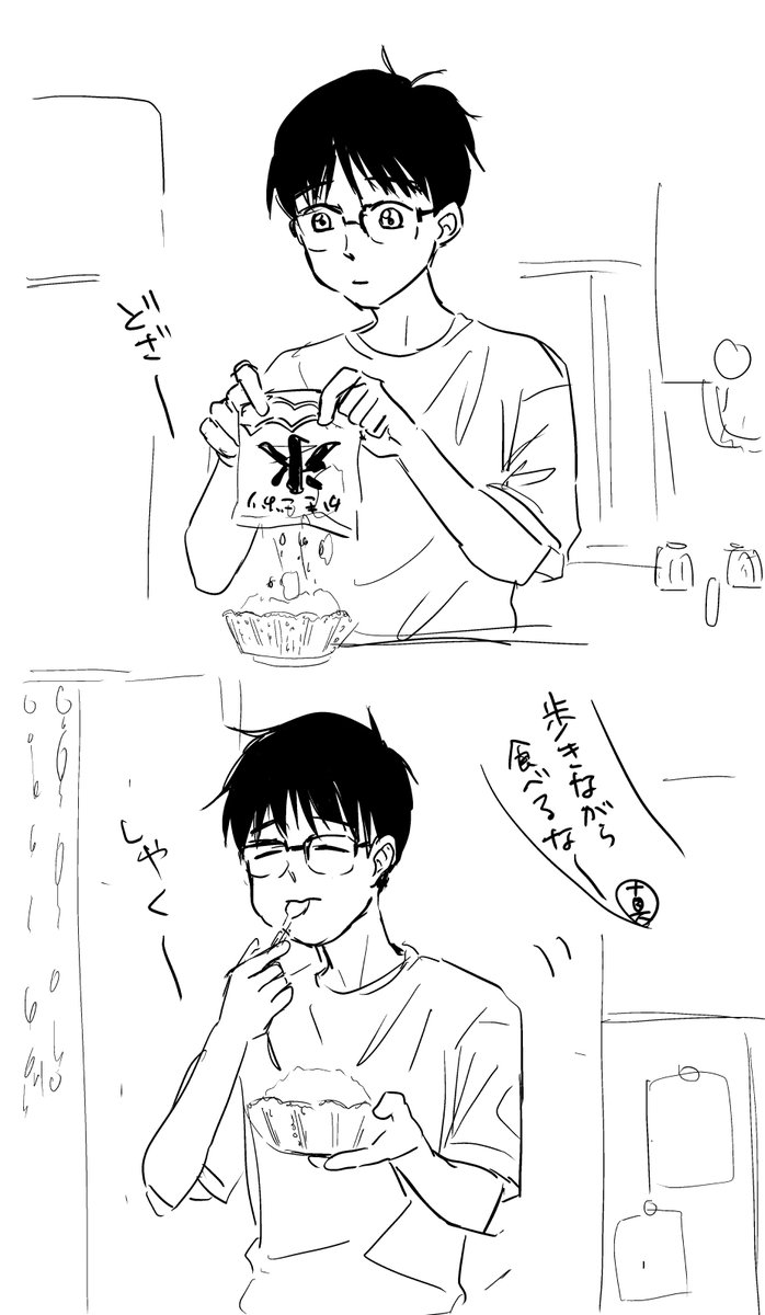 リクエストいただきましたかき氷たべるゆうりくんです たぶん中学生、某T製菓の袋のかき氷です