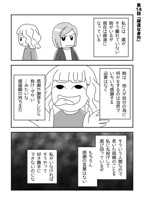 #介護漫画 #エッセイ漫画 #漫画が読めるハッシュタグ 第14話「疎遠な身内」 どちらが正しい間違っているではなく価値観が合わないんです。 姉は私を攻撃する時?変顔をすることがあるのですが、バカにすることで自分が上位であると思いたいのかな? こちらはいい歳して幼稚だなとしか思えませんが。