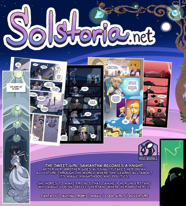 Happy #webcomicday !! Solstoria is a webcomic about two siblings, one who becomes a knight to explore her world and the other who gets possessed by a crow lord and has to guide his sister to safety!!