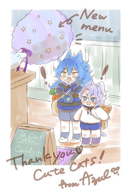 34 265 飼い主におつかいの帰りにこのお店でおやつを買いなさいと言われたのでお金を渡したら特大コットンキャンディが出てきた回🐱 実際は🐙のお店の新メニューのテスト販売なのでした😋 ※💀🐙ネコショタ化 23/03/28 23:36