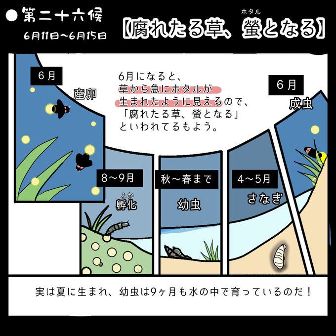 6/11~6/15は暦の上ではホタルが見れる日だそうな!#七十二候 #二十四節気 #イラスト #ホタル #腐れたる草螢となる note.com/chateau_satou/…