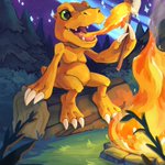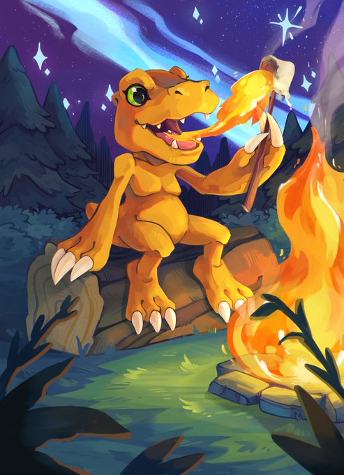 Here was my entry for the 2023 Digimon Illustration Competition; I had a lot of fun drawing Agumon having a yummbi treat! Sadly didn't make it past round 1, but congratulations to everyone who did :D #DIGIMONCON #digimon #デジモン