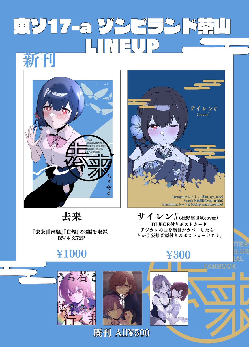 #C102 お品書きです!!! 新刊『去来』(引用にサンプル)に加え、「サイレン#」(杜野凛世風cover)音源付きのポストカードも頒布します。 ギリギリ進行で頑張ってるので音源のサンプルは明日投稿します…! 2日目【東ソ17a】でお待ちしておりますので、よろしくお願いします🙇♂️ twitter.com/chayamanozombi…