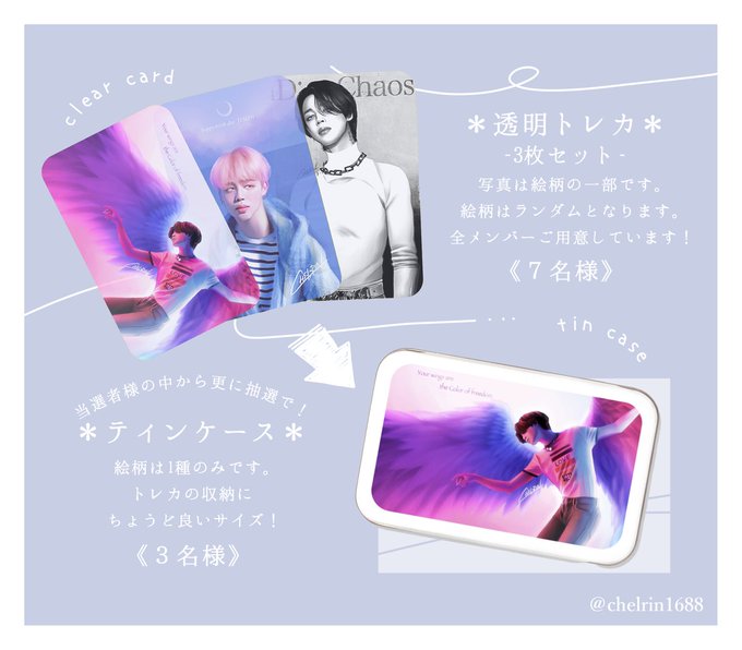 🐣ジミンセンイルW企画🌙 【ソンムル企画】 トレカ3枚セットを計7名様に! 更にその中から3名様に トレカサイズの缶ケースを ソンムル致します! ※応募方法と条件/締切は 画像2枚目をお読み下さい。 【ネットプリント】 6枚+シークレット2枚 ※ローソンorファミリーマート限定 #첼린ソンムル